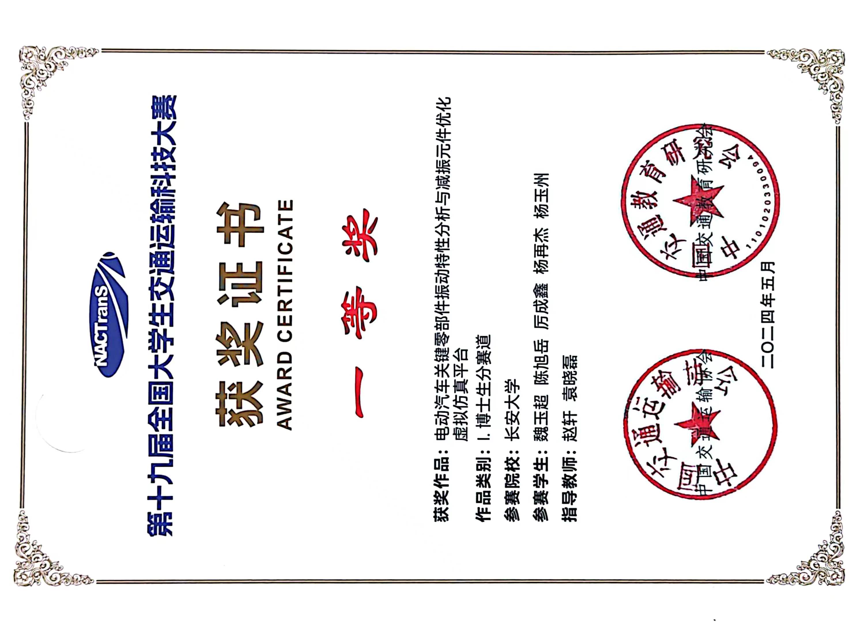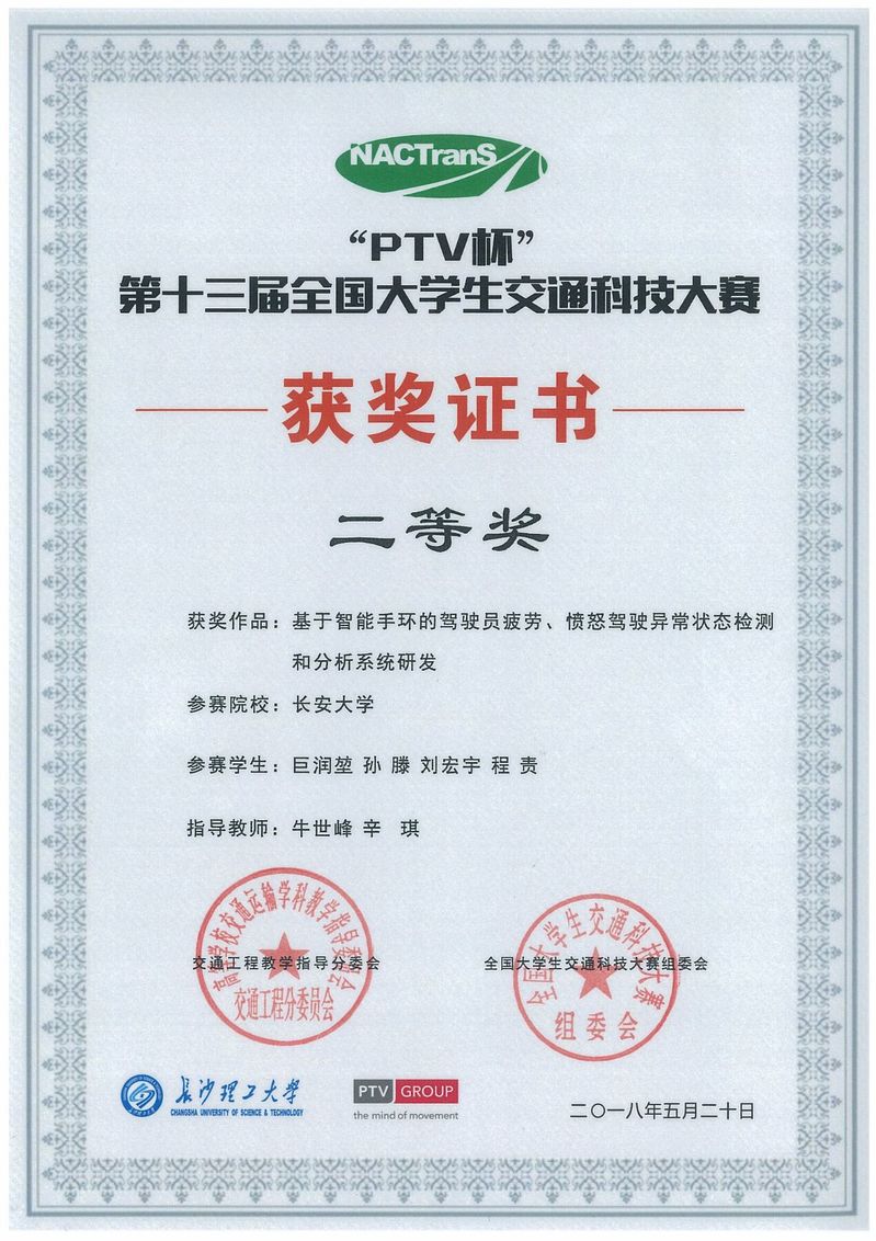 太阳城赌场 在2013年“千方科技杯” 第八届全国大学生交通科技大赛中,作品《基于LTE技术的新能源公交远程实时车况监控系统研究》荣获全国总决赛二等奖。在2018年“PTV”杯第十三届全国大学生交通科技大赛中,牛世峰、辛琪指导的参赛作品获得二等奖,王畅指导的参赛作品获得三等奖。在2024年第十九届全国大学生交通科技大赛中,赵轩、袁晓磊指导的参赛作品获得一等奖,王畅、付锐指导的参赛作品获得二等奖。