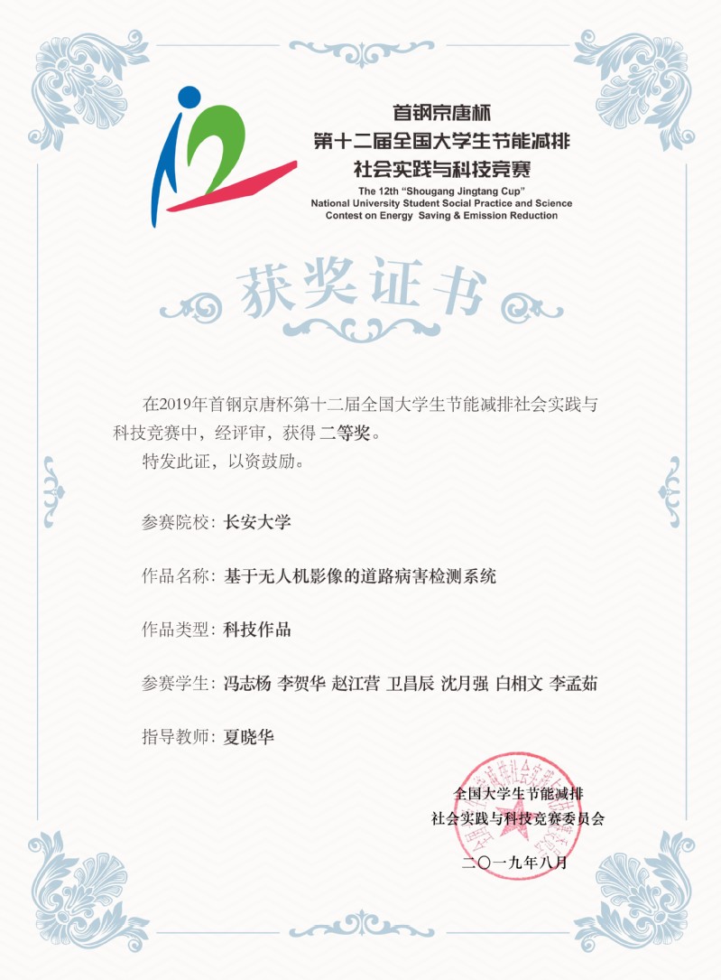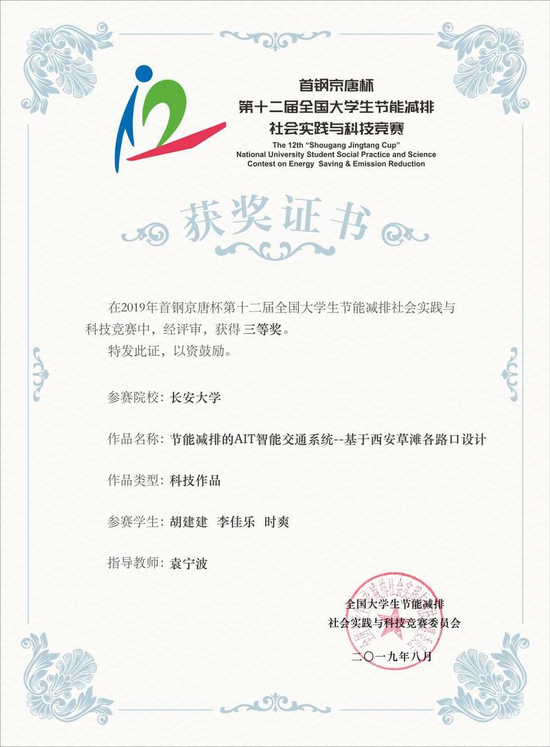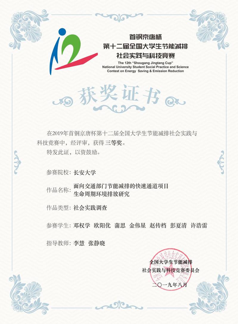 自2019年起,太阳城赌场 获准承担该项竞赛校内组织工作。在第十二届(2019年)全国大学生节能减排社会实践与科技竞赛中,我校获得国家级三等奖2项,二等奖1项,长安大学荣获优秀组织奖;在第十三届(2020年)全国大学生节能减排社会实践与科技竞赛中,我校获得二等奖1项、三等奖三项,其中,由太阳城赌场 赵轩教授和邱兆文教授指导本科生完成的参赛作品“增程式重型商用车的再生制动系统与缓行器联合控制装置”获得三等奖。