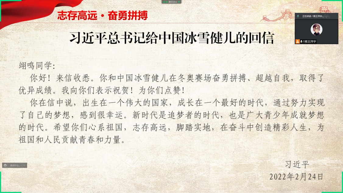 团支书王涔宇带领支部成员认真学习了习近平总书记给中国冰雪健儿的回信。习近平总书记的回信满怀对冰雪健儿的关爱关怀,也体现了对广大青年的谆谆嘱托和殷切期望。信中字里行间饱含深情与对青年的鼓励,这份鼓励与嘱托,凝聚起“一起向未来”的磅礴力量。随后,支部成员一起学习了《中国共产主义青年团章程》,通过学习团的基本知识和团的光荣传统,支部成员了解了团的性质、任务,团员的权利、义务和团内各项规章制度,增强了同学们作为一名共青团员的光荣感和责任感。