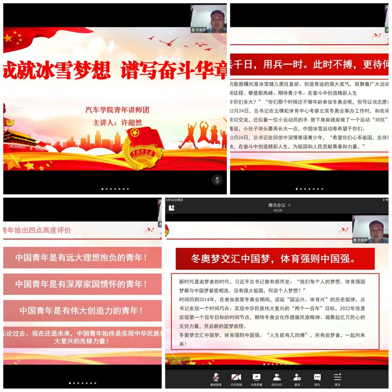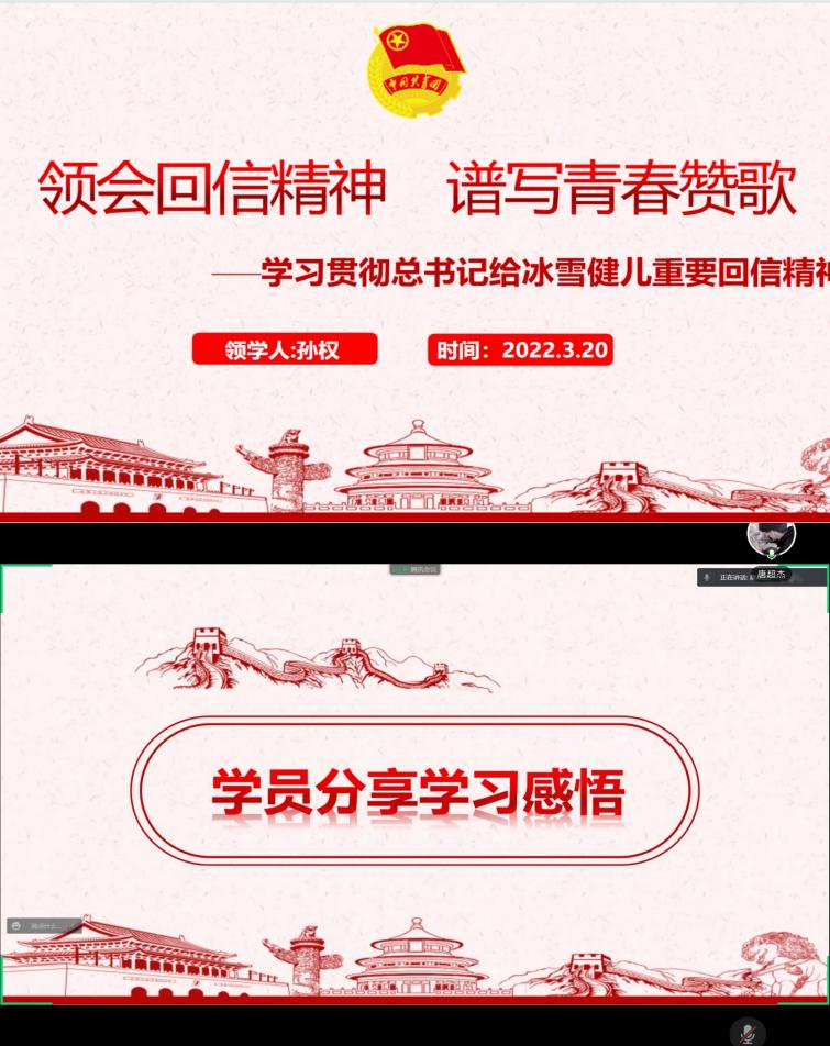 为深入学习贯彻总书记给冰雪健儿的重要回信精神,牢记总书记的殷切期望和谆谆教诲,3月20日,太阳城赌场 青年讲师团采取了线上宣讲的形式,举行了以“领会回信精神,谱写青春赞歌”为主题的会议,对2月24日习近平总书记给中国冰雪健儿重要回信精神进行了解读与交流。太阳城赌场 青马班全体成员、学院团委书记李金檑老师、青年讲师团代表许超然老师参加会议。会议由青马部部长孙权主持。
