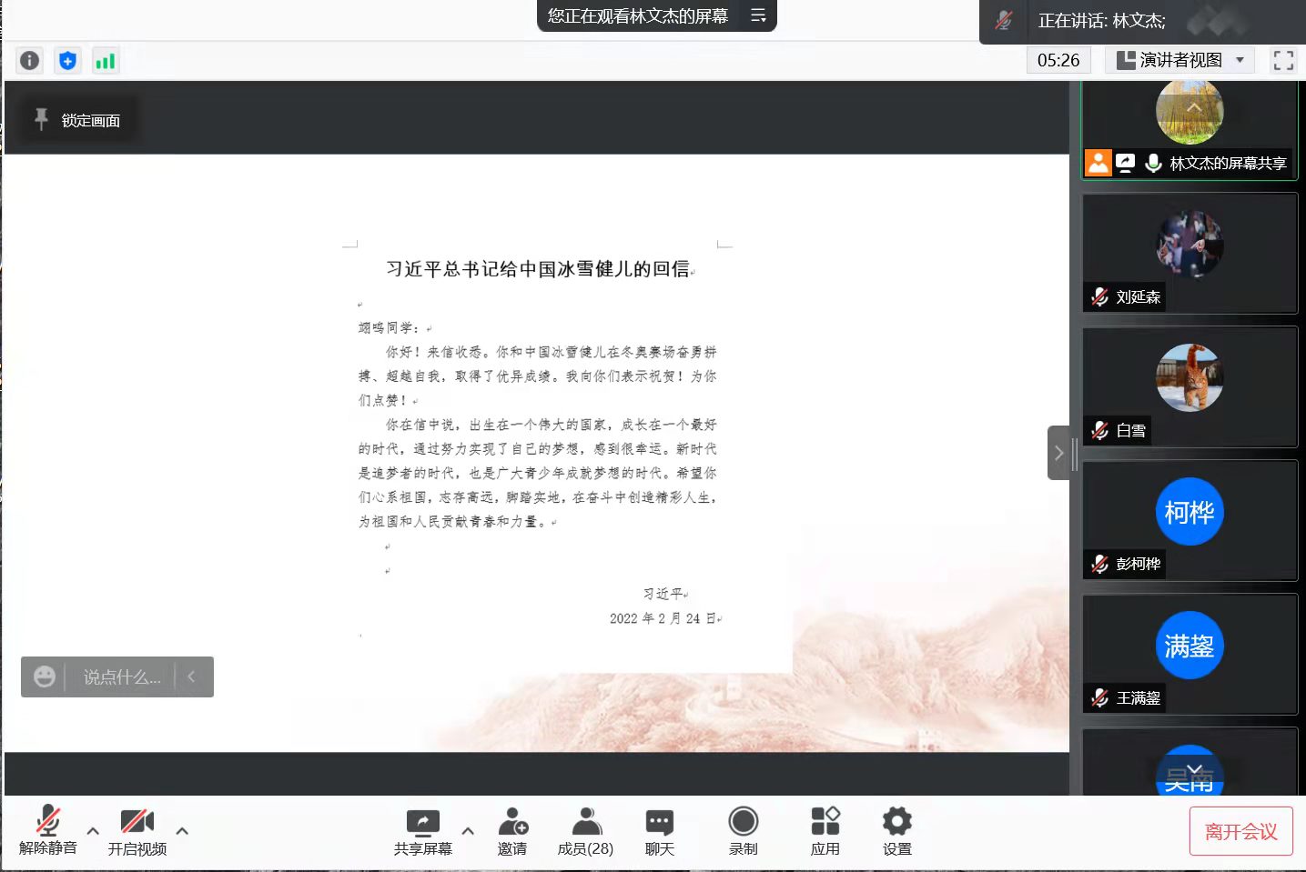 3月20日,团支部开展学习习近平总书记给中国冰雪健儿回信精神主题团日活动,团支书林文杰结合冬奥健儿赛场表现,以任子威“摘金”,苏翊鸣“摘银”,谷爱凌完成高难度动作夺冠为例,讲解北京冬奥会上运动健儿们顽强拼搏,摘金夺银,圆梦冬奥,为国争光的动人故事。呼吁同学们在为奥运冠军鼓掌喝彩的同时,也要心向阳光,坚定理想信念,坚信奋斗意义,不抛弃、不放弃,终会守得云开见月明。