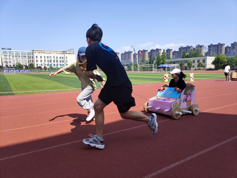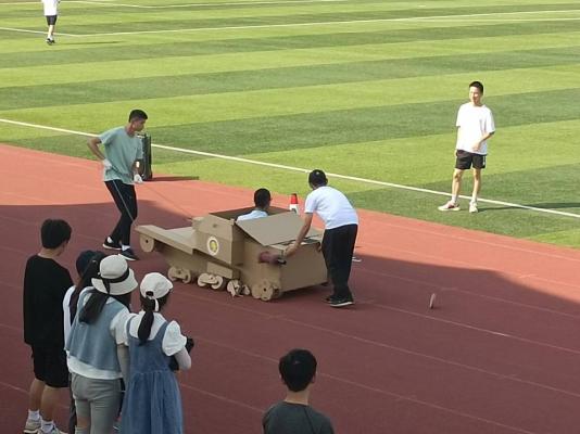 各位参赛队伍依次向评委老师从设计理念、车身结构等方面介绍各自利用瓦楞纸板和PVC管、饮料瓶等众多废旧材料制成的纸箱车,并参加创意赛和竞速赛比拼。评委分别从外观设计、速度竞赛、团队协作三个环节进行打分,全方面考量纸箱车的性能与学生团队的合作能力。