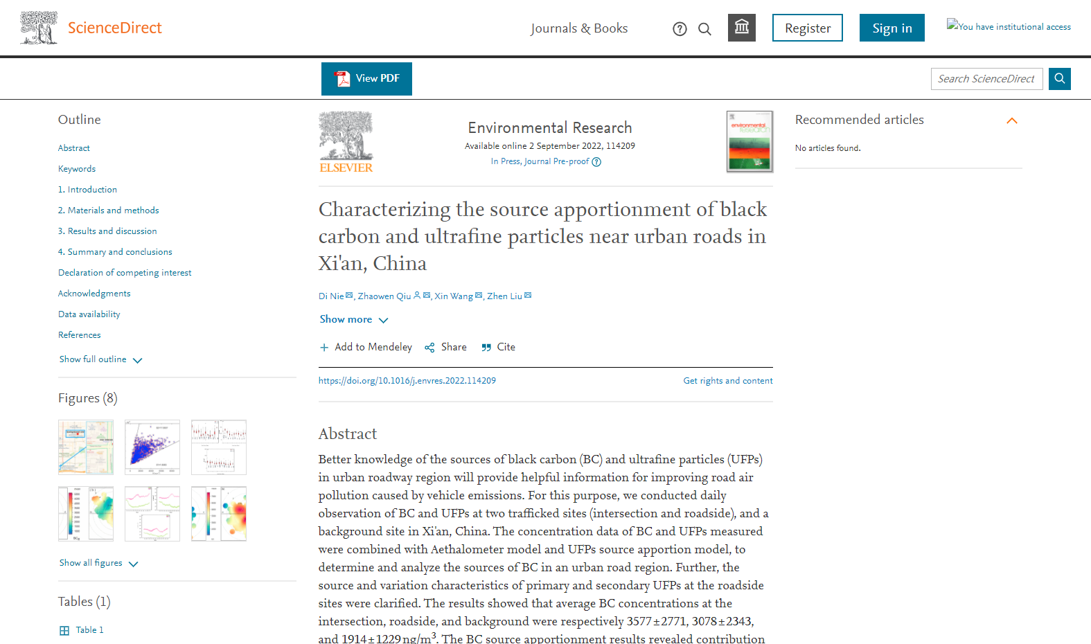 2022年9月2日,国际重要期刊《Environmental Research》(IF=8.431,top Journal)在线发表了澳门太阳城赌场 邱兆文教授团队的研究成果“Characterizing the source apportionment of black carbon and ultrafine particles near urban roads in Xi'an, China”。该论文第一作者为澳门太阳城赌场 硕士研究生聂迪,邱兆文教授为通讯作者。