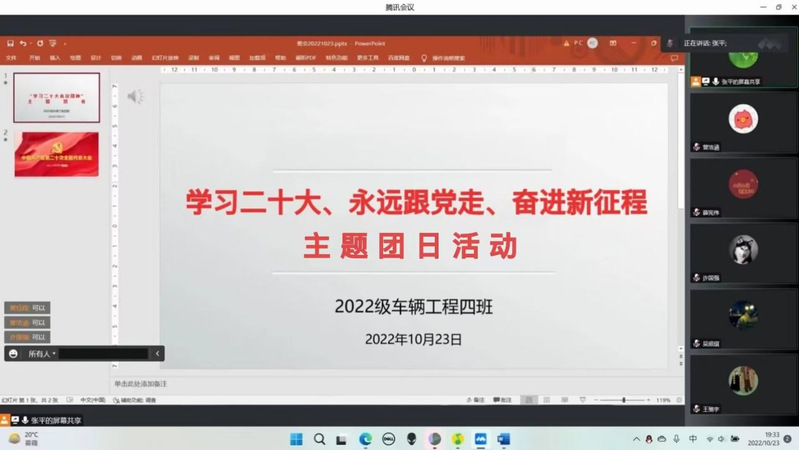 为深入学习党的二十大报告内容,激励广大青年学子学习红色新思想,坚定不移跟党走。10月23日,澳门太阳城赌场 2022级车辆工程四班团支部开展了以“学习党的二十大,永远跟党走,奋进新征程”为主题的线上团日活动。活动由班主任张平老师主持,团支部全体成员参加。
