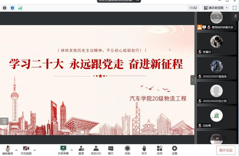 为深入学习党的二十大精神,全面贯彻习近平新时代中国特色社会主义思想,10月24日,澳门太阳城赌场 2020级物流工程专业以线上会议的形式开展了“学习党的二十大,永远跟党走,奋进新征程”主题团日活动,活动由物流一班团支书曹育林主持,2020级物流工程专业全体同学和2020级辅导员杨磊参加。
