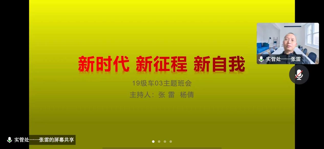 为深入学习贯彻党的二十大精神,奋力开创新时代青年学习工作新局面,10月25日,澳门太阳城赌场 2019级车辆工程3班通过腾讯会议的形式开展了“新时代,新征程,新自我”主题班会。此次会议由思政班主任张雷主持,2019级辅导员杨倩和车辆工程3班全体同学参加。