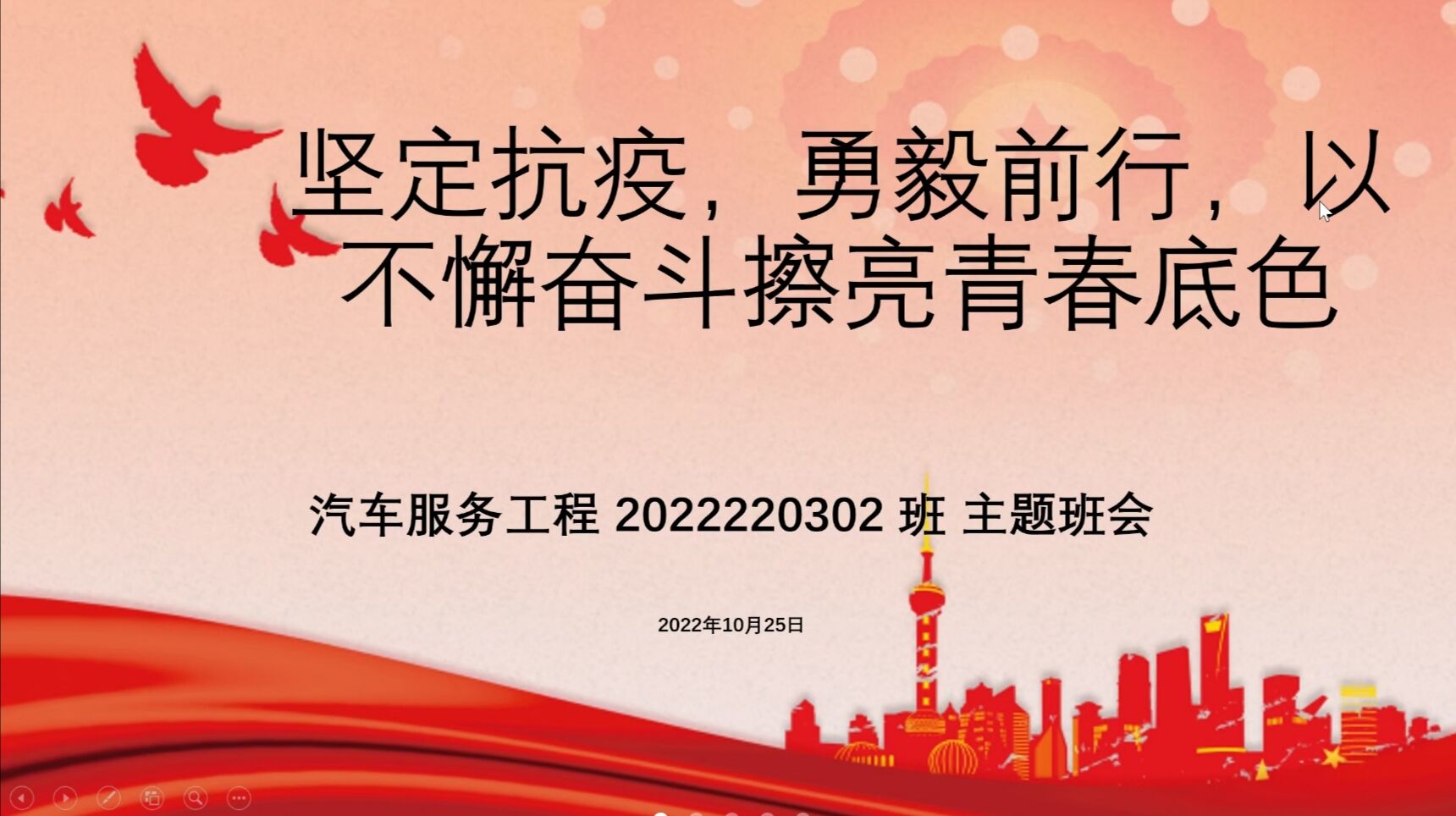 “云天收夏色,木叶动秋声。”2022年10月25日,澳门太阳城赌场 2022级汽车服务工程二班通过腾讯会议形式召开“坚定抗疫,勇毅前行,以不懈奋斗擦亮青春底色”主题班会,学生办公室主任郑文捷及班级全体同学参会,班主任张凯超主持。