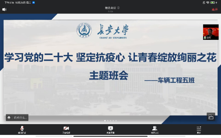 2019级车辆工程5班通过腾讯会议线上开展了“学习党的二十大 坚定抗疫心 让青春绽放绚丽之花”主题班会。会议由思政班主任石赟琦主持,班级全体成员参加。
