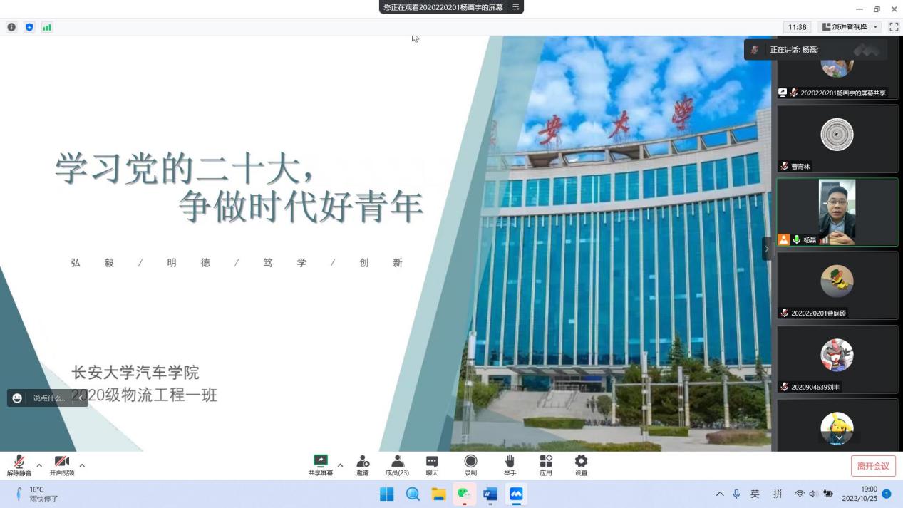 为深入学习党的二十大精神,全面落实好学校防疫工作各项要求,10月25日,澳门太阳城赌场 2020级物流工程一班举办“学习党的二十大,争做时代好青年”主题线上班会。澳门太阳城赌场 副院长赵轩教授出席本次班会,2020级物流工程一班全体同学参会,本次班会由2020级辅导员杨磊主持。