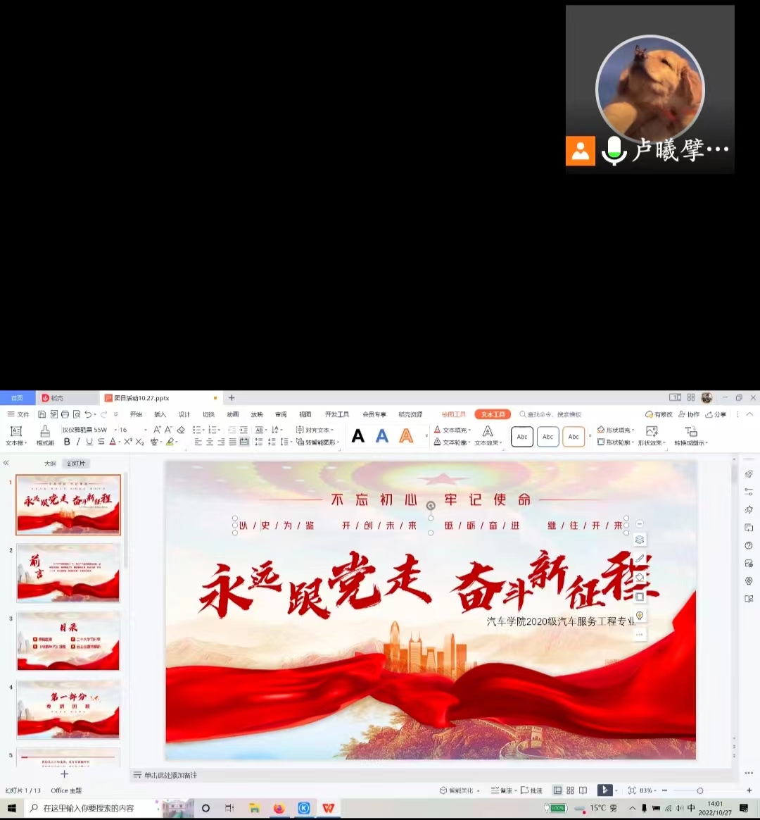 会议伊始,卢曦擘带领全体成员重温团歌,发挥了基层团支部团结同学的作用。接下来,卢曦擘就党的二十大的会议报告做出了自己的学习分享,带领同学们认真学习了习近平总书记在党的二十大的报告,简要介绍了中国近年来取得的成就,提升了同学们的民族自豪感和爱国之心。