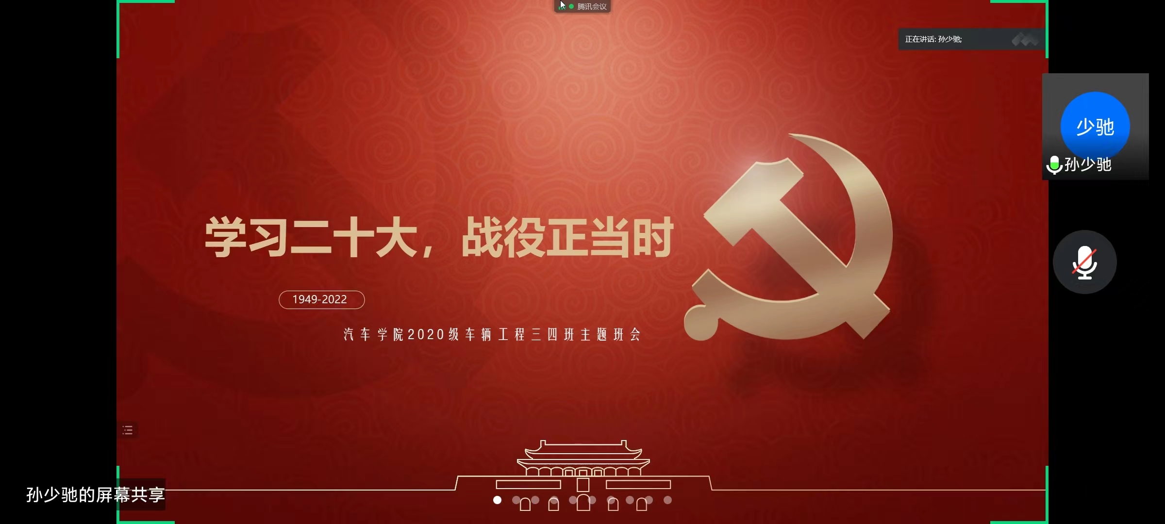 为深入学习党的二十大精神,贯彻落实学校防疫措施,10月27日,澳门太阳城赌场 2020级车辆工程三四班联合举行“学习党的二十大,争做抗疫生力军”线上主题班会。班会由车辆工程三班班长孙少驰主持。