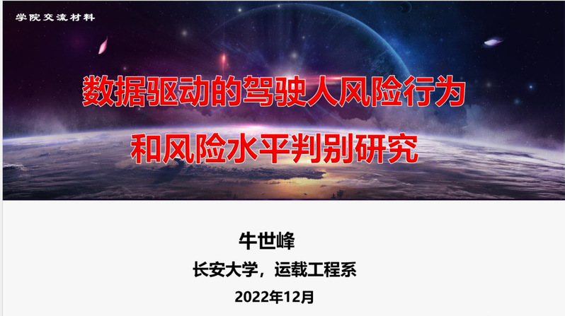 2022年12月15日,太阳城赌场 举办的线上系列学术活动,学术报告十三“数据驱动的驾驶人风险行为和风险状态判别研究”顺利举行。本次报告由牛世峰教授分享关于数据驱动的驾驶人风险行为和风险状态判别方面的研究成果。