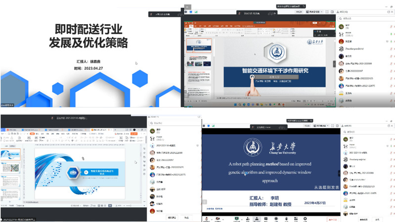 会议首先由硕士研究生徐嘉鑫作了《即时配送行业发展及优化策略》的报告,从即时配送行业现状及发展趋势、即时配送行业研究报告以及优化策略相关文献分享三个方面进行汇报。对即时配送的策略进行了梳理,对即时配送的未来研究提出了自己的见解;硕士研究生成朋乐对《未来智能交通系统的概述与优点》进行汇报,立足于我国智能交通系统的特点,讲述了智能网联交通技术体系架构,对未来智能交通系统的发展提出了展望;硕士研究生张正晴研究了《智能交通环境下干涉作用研究》,对智能交通干涉模型以及交通流预测模型进行了介绍,详细讲解了T-GCN模型的搭建步骤。