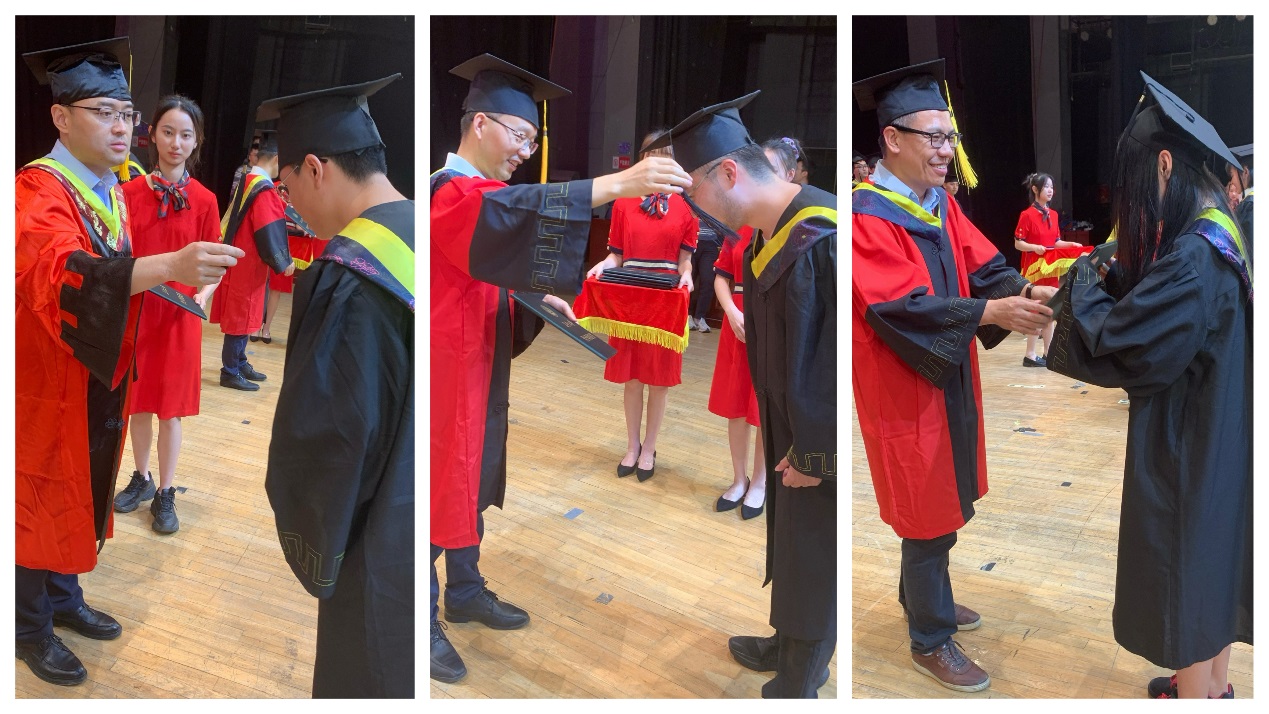 林贵宝宣读授予学士学位学生名单,澳门太阳城赌场 357名本科毕业生身着学士服,按照专业班级依次上台,太阳城赌场 学位评定分委员会主任委员赵轩教授、副主任委员邱兆文教授和牛世峰教授逐一为毕业生拨穗正冠并颁发学士学位证书,随后师生合影留念。