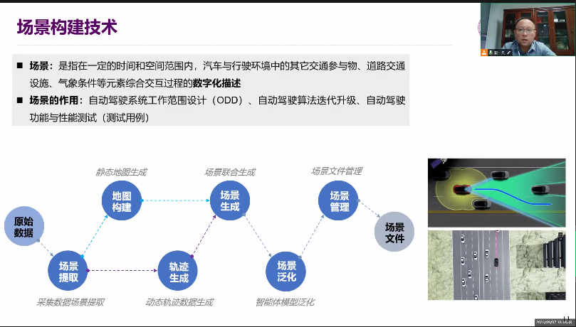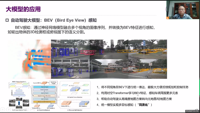 戴一凡博士讲授的课程名称为“智能网联汽车大数据治理与大模型技术”。戴博士分别从数据驱动的智能网联汽车研发、汽车大数据治理技术、大模型技术及其应用三个方面,讲授了在AI最新发展的形势下,大数据、大模型在智能网联汽车中的应用。以海量数据、车端云端算力、新算法大模型为核心要素,实现感知数据与场景数据闭环,形成智能网联汽车大数据治理平台。讲授了数据采集技术、数据标注技术、构建场景技术、测试评价技术。对大模型的定义、大模型的特点、大模型的应用进行了详细的介绍,其中对视觉大模型的图形分割SAM、自动驾驶的BEV感知、端到端(感知决策一体化)等自动驾驶领域的最新技术的应用做了讲授。