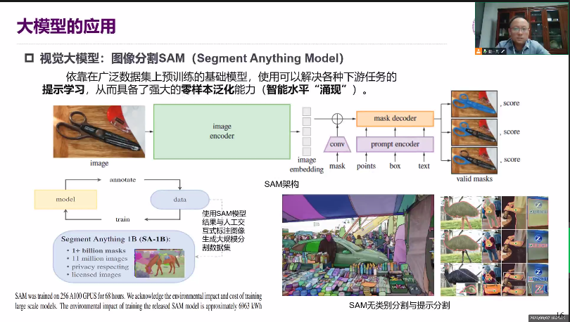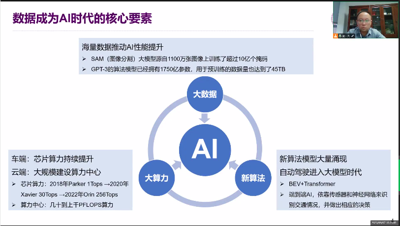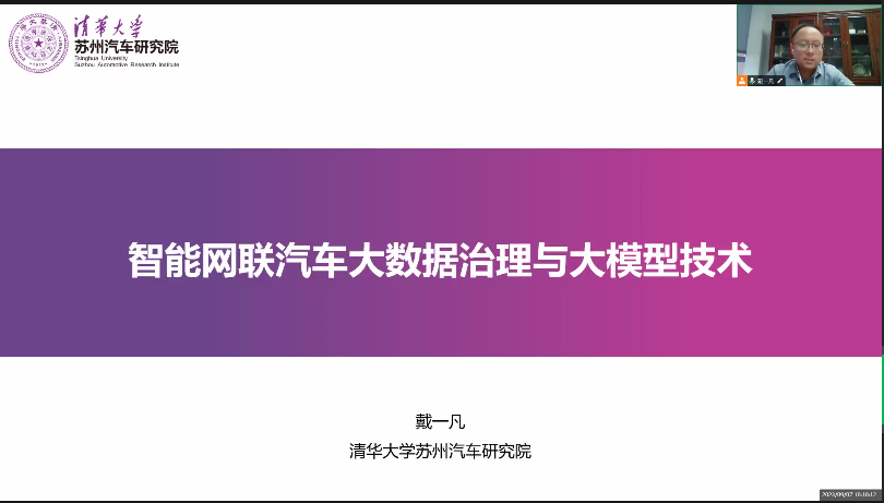 戴一凡博士讲授的课程名称为“智能网联汽车大数据治理与大模型技术”。戴博士分别从数据驱动的智能网联汽车研发、汽车大数据治理技术、大模型技术及其应用三个方面,讲授了在AI最新发展的形势下,大数据、大模型在智能网联汽车中的应用。以海量数据、车端云端算力、新算法大模型为核心要素,实现感知数据与场景数据闭环,形成智能网联汽车大数据治理平台。讲授了数据采集技术、数据标注技术、构建场景技术、测试评价技术。对大模型的定义、大模型的特点、大模型的应用进行了详细的介绍,其中对视觉大模型的图形分割SAM、自动驾驶的BEV感知、端到端(感知决策一体化)等自动驾驶领域的最新技术的应用做了讲授。