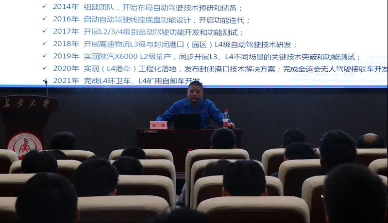 本次讲座主题为《陕汽集团自动驾驶商用车开发》,赵峻老师从目前国内自动驾驶技术的进展讲起,围绕自动驾驶技术发展、学术前沿动态、技术更新迭代等主题展开,通过向同学们展示目前正在研究的自动驾驶产品实例,从开发背景、产品方案、技术方案力、技术开发与应用等多种方面详细解释了它们的工作原理和应用场景,让大家全面了解了产品的发展前景,感受到了科技的进步和汽车行业的变革。