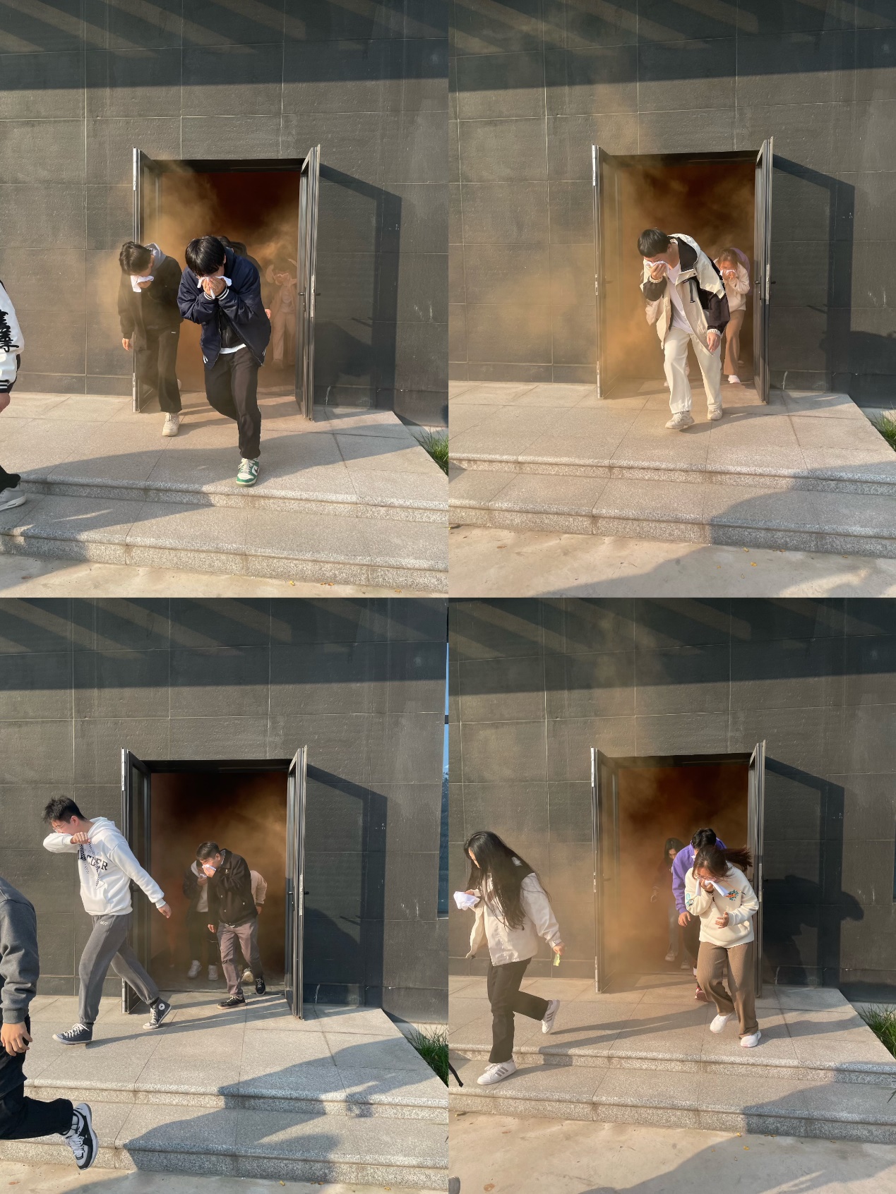随后,在消防安全专家的指导下,澳门太阳城赌场 师生开展了消防安全演练。听到警报声后,在老师的带领下学生们弯着腰、猫着步、用毛巾捂住口鼻,沿着疏散通道快速前进,有序撤离到学院楼东侧的安全地带,之后张强老师清点人数,全体师生安全撤离,用时仅2分钟。