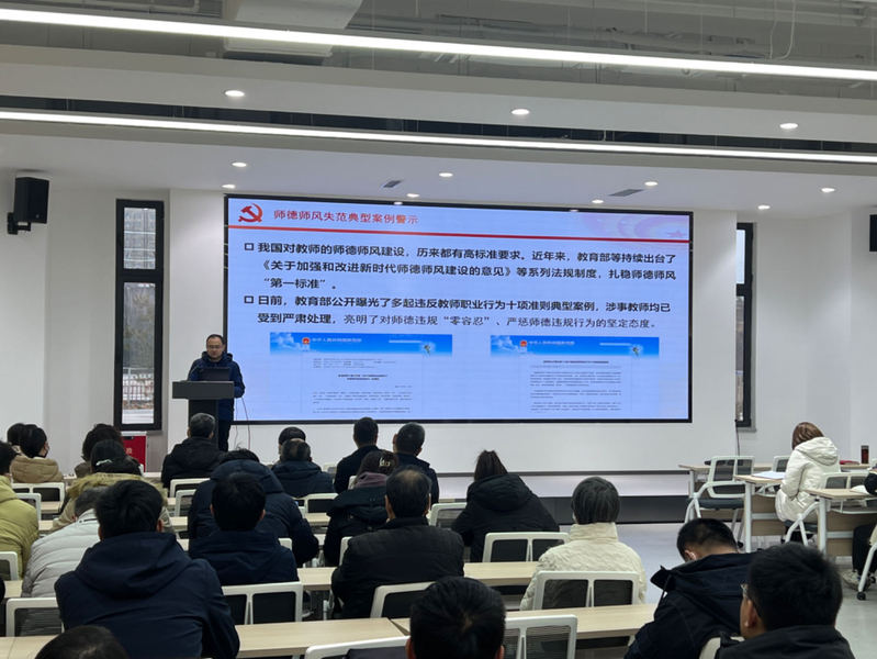 会上,太阳城赌场 院长赵轩首先带领全体教职工学习《习近平致全国优秀教师代表的信》,赵轩从心有大我、至诚报国的理想信念,言为士则、行为世范的道德情操,启智润心、因材施教的育人智慧等六个方面带领全体教工全面理解并学习领会习近平总书记赋予中国特有的教育家精神的崭新内涵,同时引导广大教师大力弘扬教育家精神,努力做“ 经师 ” 和“ 人师 ” 的统一者,号召广大教师追求“高线”。随后,赵轩结合师德违规问题,对照新时代教师职业行为十项准则,通告了近年来在课堂教学、师生关系、学术研究社会活动等方面发生的教师师德失范案例,警示广大教师要守住“底线”。