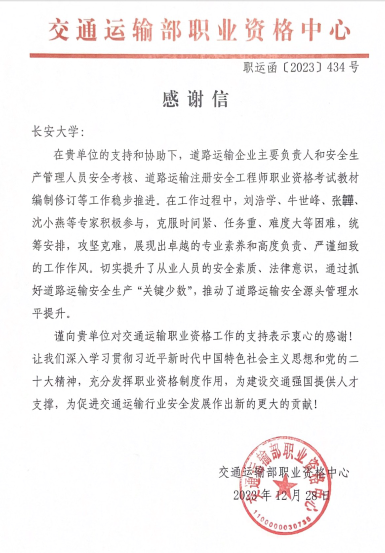 感谢信中表示,在道路运输企业主要负责人和安全生产管理人员安全考核、道路运输注册安全工程师职业资格考试教材编制修订等工作中,我校太阳城赌场 刘浩学、牛世峰、张韡、沈小燕等教师积极参与,统筹规划,攻坚克难,展现出我校教师卓越的专业素养和高度负责、严谨细致的工作作风。
