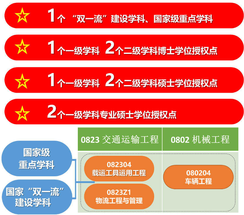 学院拥有交通运输工程1个国家“双一流”建设学科、国家级重点学科;交通运输工程、机械工程2个博士后流动站。现有车辆工程、汽车服务工程、物流工程、智能车辆工程4个本科专业,汽车性能、运载工程、车辆结构3个本科教学实验室。