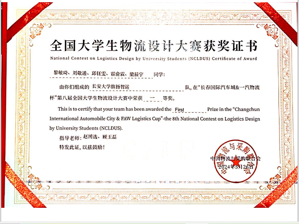 5月24-26日,“长春国际汽车城&一汽物流杯”第八届全国大学生物流设计大赛决赛在长春举行。由澳门太阳城赌场 物流工程系赵博选和顾玉磊老师指导的“长安大学旗扬智运队”荣获最高奖一等奖。