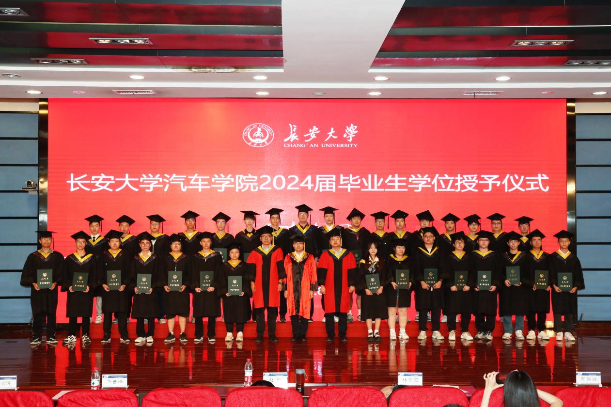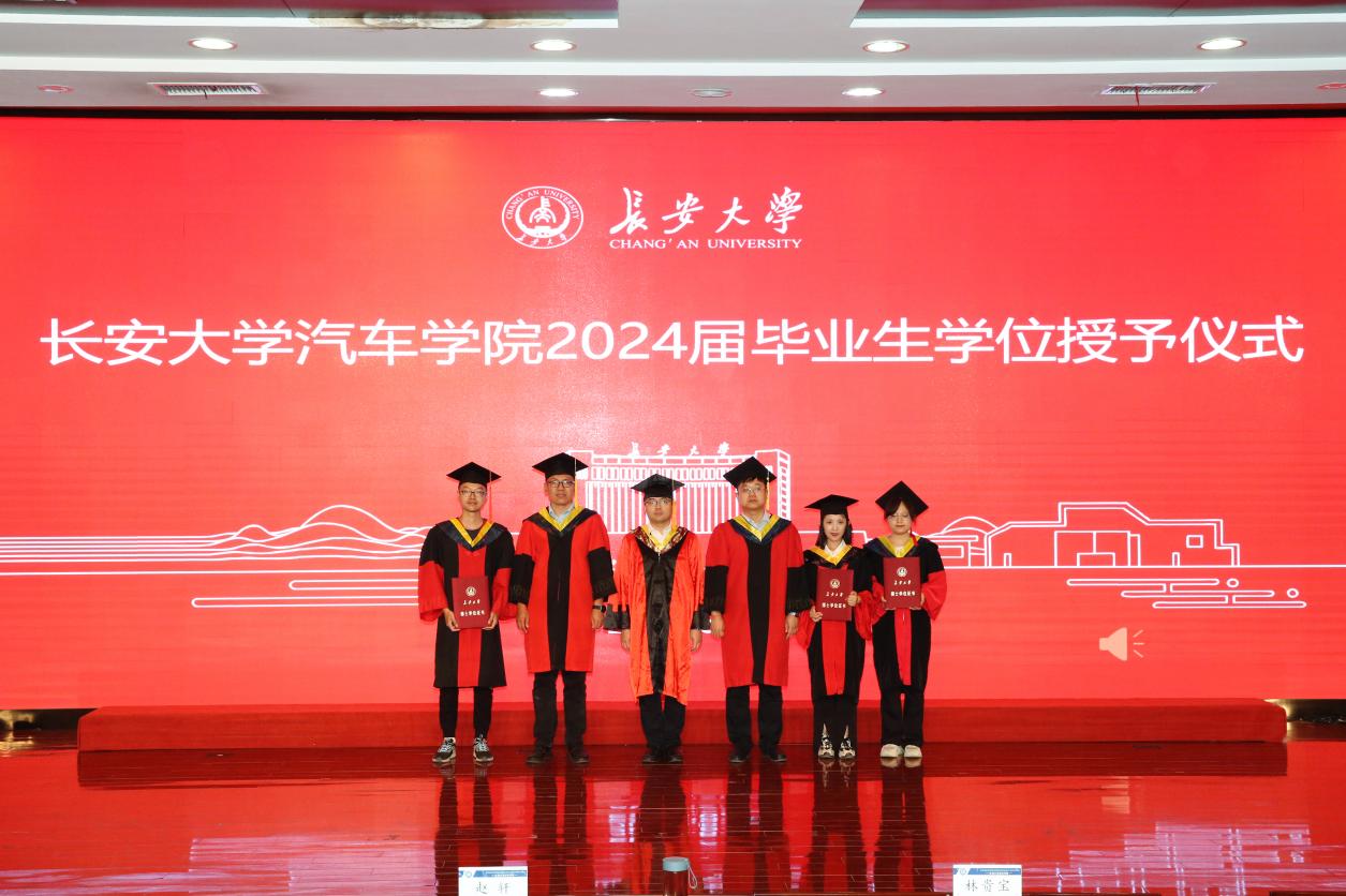 林贵宝宣读授予博士、硕士和学士学位学生名单,2024届毕业生身着学位服,按照专业、班级依次上台。太阳城赌场 学位评定分委员会主席赵轩教授、委员牛世峰教授和陈轶嵩教授逐一为毕业生拨穗正冠,颁发学位证书,并合影留念。