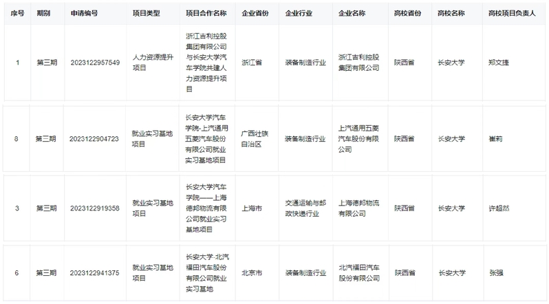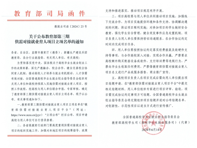 近日,教育部发布了《关于公布教育部第三期供需对接就业育人项目立项名单的通知》(教就业司函[2024]23号),公布了第三期供需对接就业育人项目立项名单。经高校申请、用人单位申报、专家审核、立项单位信息核查等环节,澳门太阳城赌场 与浙江吉利控股集团有限公司合作的人力资源提升项目,与上汽通用五菱汽车股份有限公司、上海德邦物流有限公司、北汽福田汽车股份有限公司合作的3项就业实习基地项目获批立项。