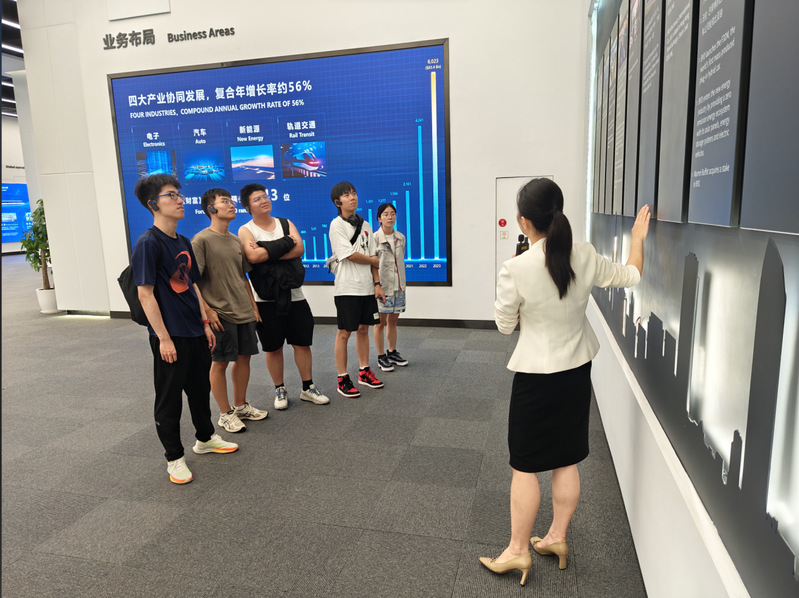 在比亚迪公司,实践队员对比亚迪公司的发展历程进行一览。学习了比亚迪最新的电动车型和电池技术、技术参数及市场定位。了解了电动乘用汽车的电池管理系统(BMS系统)和电池集成技术。在针刺穿透实验中,比亚迪“刀片电池”在穿透后无明火无烟,电池表面的温度仅有30-60℃左右,极大提升了能量密度和安全性。