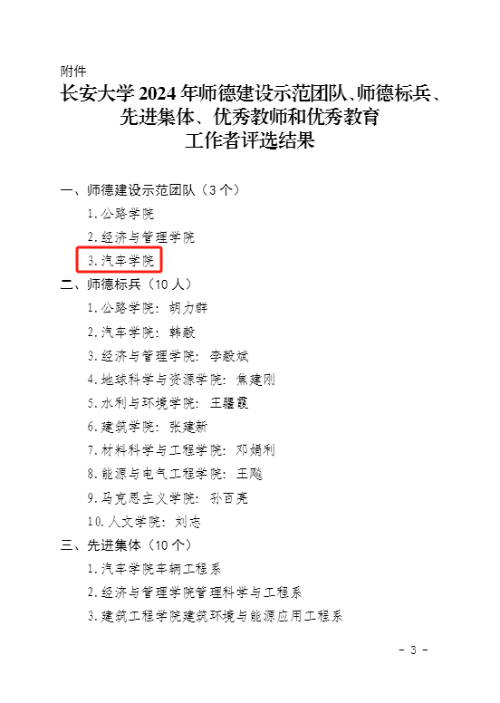 围绕“庆祝教师节”和“师德师风”建设两条主线,学院开展了丰富多彩的活动,取得了显著成效。在学院层面,通过本次活动的开展,进一步深化了对师德师风建设意义的认识,明确了师德师风建设的总体思路、工作目标和具体举措,为加强师德师风建设奠定了良好基础。在教师层面,通过多样的活动和教育,大力弘扬“教育家”精神,增强了教师的职业幸福感和获得感,树牢了教师投身教育强国建设、勇担立德树人使命的政治自觉和思想自觉。2024年,澳门太阳城赌场 车辆工程系党支部入选全国高校“双带头人”教师党支部书记“强国行”专项行动团队,学院获评长安大学师德建设示范团队,车辆工程系获评师德建设先进集体,韩毅教授获评师德标兵,郝艳召、顾玉磊、栗亮获评长安大学优秀教师(教育工作者)。