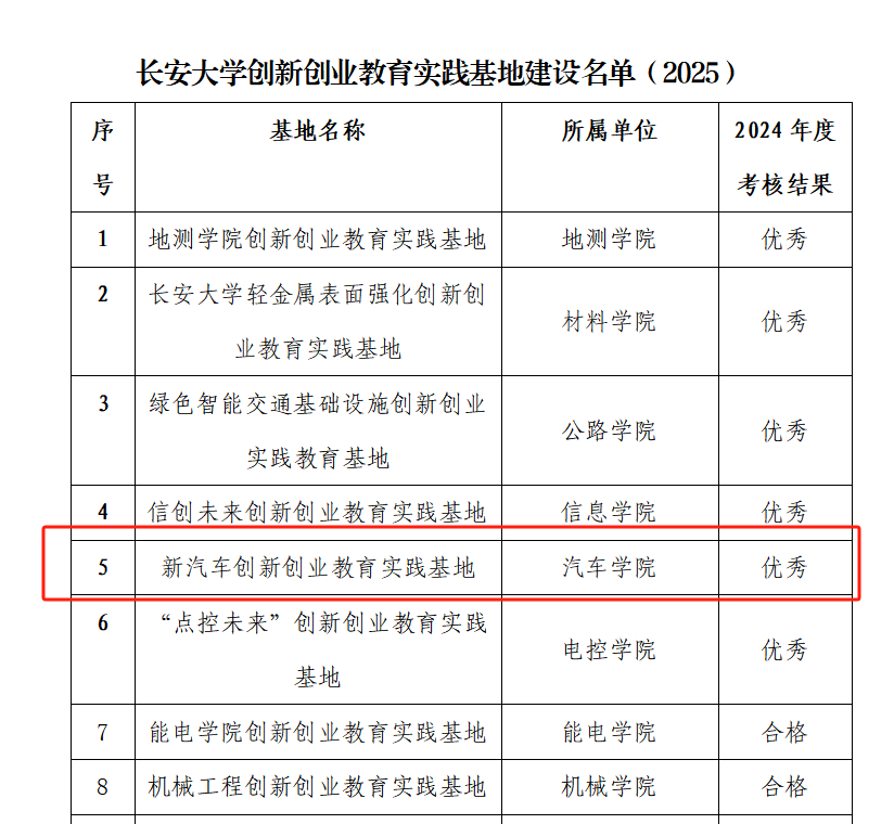 根据教务处、创新创业学院发布的《关于公布2025年度长安大学校级创新创业教育实践基地建设名单和2024年度考核结果的通知》,太阳城赌场 “新汽车创新创业教育实践基地”在2024年度考核中获评优秀等次。