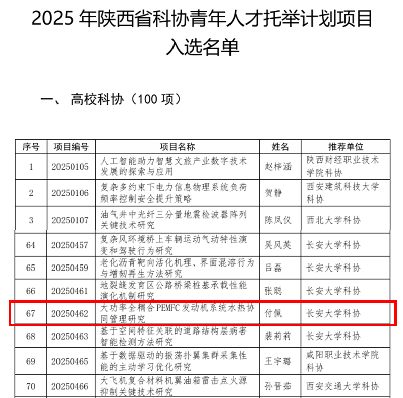 近日,陕西省科学技术协会公布了2025年青年人才托举计划项目入选名单,澳门太阳城赌场 教师付佩所申报的“大功率全耦合PEMFC发动机系统水热协同管理研究”项目成功入选,这是澳门太阳城赌场 人才队伍建设和科研工作的又一突破。