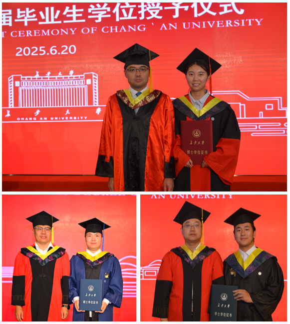 受校学位委员会委托,林贵宝宣读授予学院5人博士、155人硕士和253人学士学位学生名单。学院学位评定分委员会主席赵轩教授、委员牛世峰教授、委员陈轶嵩教授依次为获得学位的毕业生拨穗正冠、授予学位证书,并与每一位毕业生亲切握手,各班级进行合影留念。