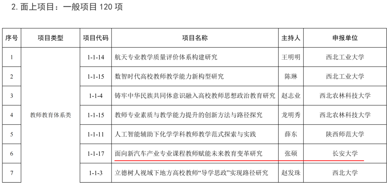 根据陕西省教师教育改革与教师发展研究项目管理办法的有关要求,陕西省教育厅组织开展了2025年度陕西省教师教育与教师发展研究项目申报和评审工作。经各单位申报、资格初审、申报公示、通讯评审和集中答辩等环节,确定拟立项教师项目369项,其中,面上项目150项(含重点项目30项,一般项目120项),人才专项项目219项。澳门太阳城赌场 教师张硕申报的面上项目一般项目“面向新汽车产业,专业课程教师赋能未来教育变革研究”获批立项。