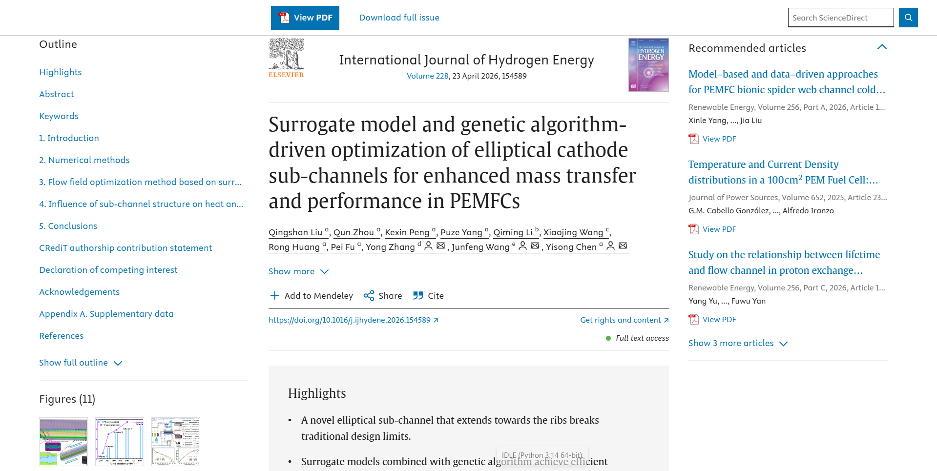 近日,国际氢能领域顶级期刊《International Journal of Hydrogen Energy》(影响因子8.3,SCI TOP期刊)在线刊发了澳门太阳城赌场 陈轶嵩教授团队的最新研究成果,论文题为《Surrogate model and genetic algorithm-driven optimization of elliptical cathode sub-channels for enhanced mass transfer and performance in PEMFCs》。此项成果的发表,标志着澳门太阳城赌场 在氢能与燃料电池技术研究领域取得新的突破性进展。该论文第一作者为澳门太阳城赌场 车辆工程系教师刘青山,陈轶嵩教授为通讯作者。